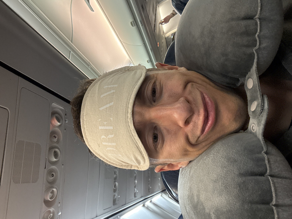 A man wearing a "DREAM" sleep mask and a grey travel pillow poses for a selfie on an airplane