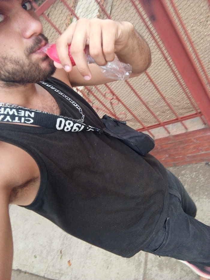 A male individual is depicted from a slightly elevated perspective in Tinaquillo, Venezuela. He possesses a beard and mustache and is wearing a black sleeveless tank top. A black and white strap, bearing partial text "NEW YORK CITY" and "1980", crosses his chest. A silver-colored chain necklace is visible beneath the strap. He also wears a black cross-body bag over his right shoulder and dark-colored pants. The subject is actively drinking from a clear plastic pouch or bottle containing a red liquid, holding it to his mouth with his left hand. Visible armpit hair is present on his right side. The background features a reddish-brown metal gate or fence. The ground directly beneath the subject is concrete.