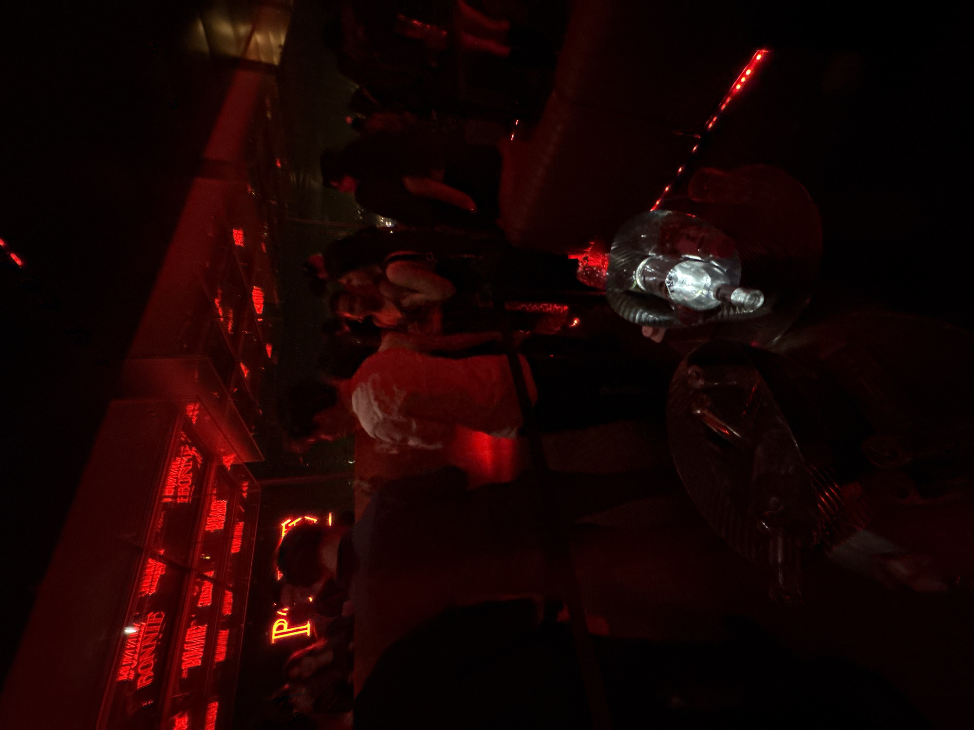 The image depicts an indoor nightlife scene within "Bonnie," a rooftop bar and club located at 10 Rue Agrippa d'Aubigné in Paris, France, part of the SO/ Paris hotel. The environment is characterized by intense red ambient lighting. Prominent red neon signage on an upper wall displays the word "BONNIE," with reflections visible on the mirrored ceiling. A partial red neon letter "P" is also discernible on a lower wall. Multiple individuals are present, their figures partially obscured by low light and motion blur. In the central midground, several people stand, mostly viewed from behind or in profile, appearing to socialize. One individual on the right midground wears a light-colored, possibly white, short-sleeved top. On the right side, a group of people is visible near a red-upholstered seating area, which appears to be a booth or lounge couch. In the immediate foreground, a table holds a clear glass bottle, presented within a distinct lighted holder or featuring internal illumination, consistent with luxury spirit service in a club setting. Red LED strip lights are visible along the floor or base of furniture, contributing to the pervasive red glow. The overall scene captures a crowded, active social atmosphere within a contemporary Parisian venue.