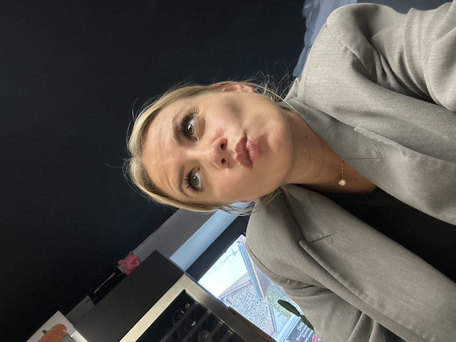 A Caucasian female, appearing to be in her late 20s to early 30s, is depicted in an indoor setting within the city of Saint-Médard-en-Forez, France