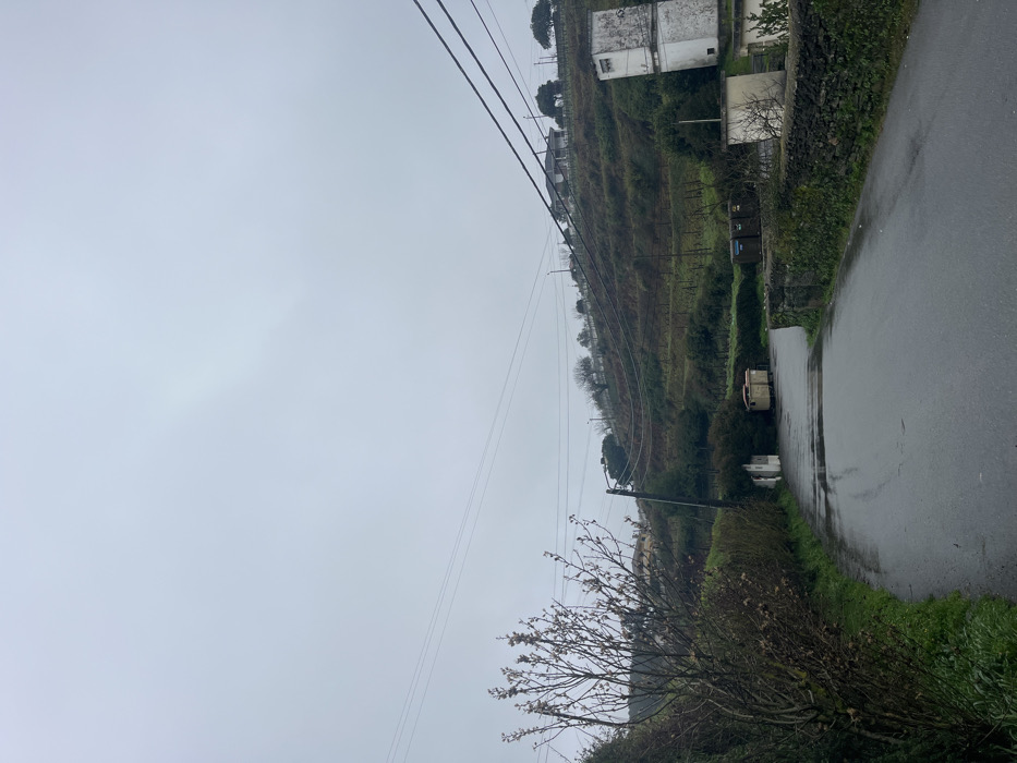 The image displays an outdoor scene in Vila Real, Portugal, characterized by an overcast, light grey sky. A wet asphalt road, indicative of recent precipitation, curves from the lower foreground towards the left and center of the frame. On the left side of the foreground, a deciduous tree with sparse buds or emergent leaves, along with green ground vegetation, lines the road. On the right foreground, a low stone wall supports low-growing green foliage. Behind this wall, a small, white, rectangular building is partially visible. Further along the right side of the road, three refuse bins—one brown, one blue, and one black—are positioned. A utility pole on the left side of the road supports multiple overhead power lines that extend horizontally across the frame and vertically up the adjacent hillside. The background is dominated by a steep, terraced hillside, densely covered with green vegetation consistent with agricultural cultivation, likely vineyards. Scattered trees and bushes are present across the slope. Along the upper part of the hillside, a winding road is visible, bordered by utility poles and streetlights, with several residential structures, including a prominent house featuring a dark roof. On the mid-right slope, a tall, slender, white utility structure, possibly a water tower, is evident. No human figures, animals, or vehicles are present in the depicted scene.