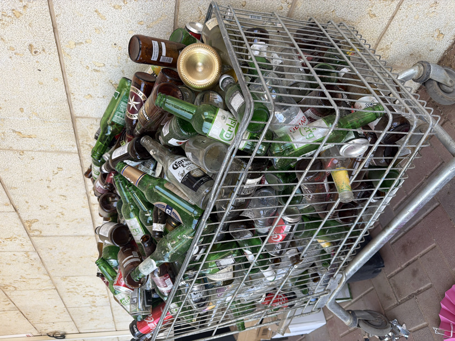 The image depicts a standard silver-colored wire shopping cart overflowing with a dense accumulation of various empty glass bottles and a few aluminum cans. The bottles are predominantly green and brown, with some clear glass, and include identifiable brands such as Carlsberg, Corona, Krombacher, and Coca-Cola Zero cans. Most bottles appear to be used beverage containers, likely beer or soda, with some labels still attached or partially visible, some exhibiting dust or residue. The cart is positioned outdoors or in a semi-enclosed area, resting on a paved surface composed of reddish-brown square tiles or bricks. Behind the cart is a light-colored, textured wall with horizontal block patterns. To the left foreground, a portion of a cardboard box is visible on the ground, and a small amount of pink folded paper material is present on the far lower left. No individuals are present in the scene, and no active interactions or actions are depicted. The location is within the Eshkol Regional Council, Israel.