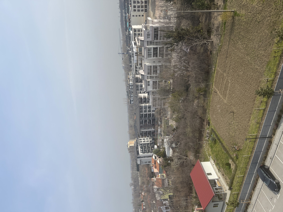 An elevated, expansive daytime view captures a mixed urban and suburban landscape in Plovdiv, Bulgaria, under a hazy, pale blue sky. The scene depicts a blend of residential development, agricultural land, and natural vegetation, suggesting late winter or early spring. In the immediate foreground, a grey paved parking lot is partially visible on the bottom left, with one black Volkswagen Golf hatchback parked in a marked bay. A dark grey metal fence, adorned with trained green vines, separates the parking lot from the main scene. Directly beyond the fence, a rectangular parcel of land features a manicured green lawn to the left and a larger, freshly tilled brown earth field to the right, showing distinct cultivation lines. A solitary human figure, dressed in dark clothing, is discernible within the tilled field, appearing to be engaged in land-tending activity. Adjacent to the left edge of this cultivated area stands a small, single-story house with light-colored walls and a prominent red gabled roof, featuring a small porch. The midground is dominated by an extensive area of dormant deciduous trees and shrubs, largely bare, interspersed with a few trees exhibiting light-colored blossoms. Further into the background, numerous multi-story residential buildings, predominantly modern apartment complexes with light-colored facades and dark roofs, populate the landscape. Older, smaller houses with traditional tiled roofs are visible amongst the trees on the left. A large blue tower crane is visible on the far right horizon, indicating ongoing construction. The distant horizon appears flat and merges into the pervasive atmospheric haze. No other individuals are clearly visible or engaged in specific actions.
