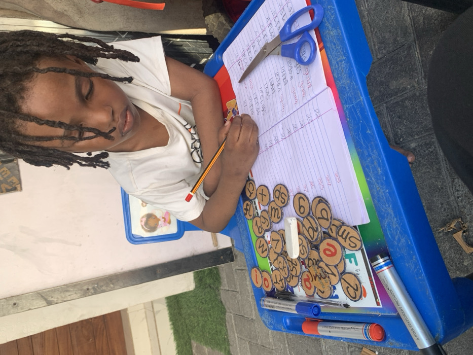 A child with dreadlocks is sitting at a blue table, writing in a notebook. The notebook contains handwritten lists and numbers. Beside the notebook are various learning materials including wooden disks with letters and numbers, scissors, colored markers, and a white eraser. The brand "STAR STATIONERY PRODUCTS" is visible on one of the markers. The child is focused on the task, holding a pencil. The setting appears to be outdoors.