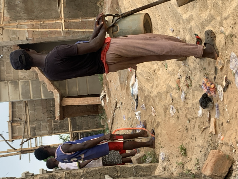A man in a black shirt, brown pants, and a cap is carrying a container using a metal bar. Behind him, a building under construction is visible. In the foreground, two men are working with a long, orange saw-like tool. The ground is covered in sand and strewn with various pieces of debris, including paper and plastic bags. One man wears a blue jersey, red shorts, and sandals. Another man is standing beside him with an unseen attire.