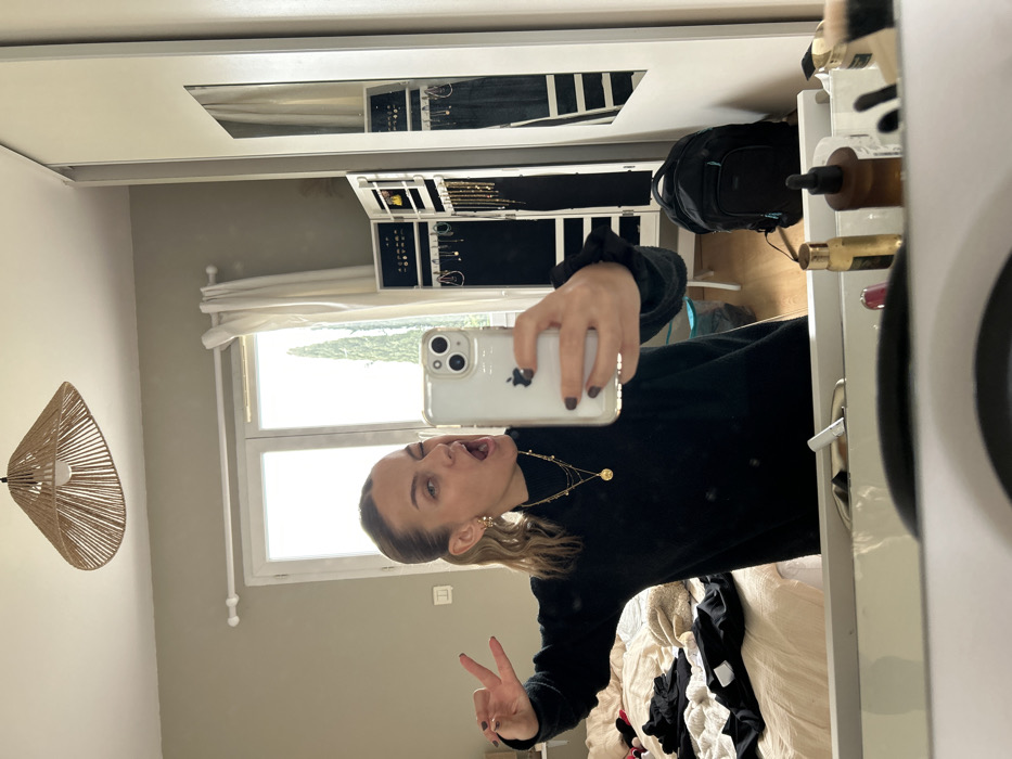 The image depicts a mirror selfie taken inside a residential building in Veauchette, France. The central subject is a female, approximately 20-30 years old, with light brown hair pulled into a low ponytail. She wears a black long-sleeved top, multiple gold-colored necklaces (including one with a circular pendant), and gold-colored hoop earrings. Her left hand is raised, forming a "peace sign," while her right hand holds a light-colored smartphone (possibly an iPhone in a clear case) to capture the reflection. Her facial expression shows her right eye winked shut and her mouth open in an O-shape. Her fingernails are painted a dark shade. The foreground consists of a reflective surface, likely a vanity or dresser top, where various cosmetic items are present, including a white tube, a gold-colored bottle, a dark dropper bottle, and a makeup brush with dark bristles. The background reveals a room interior. To the left, an unmade bed with light-colored bedding and scattered dark clothing items is visible. Above, a woven, natural-fiber lampshade hangs from the ceiling. A large white-framed double window dominates the central background, flanked by light-colored curtains. Through the window, a clear sky and a tall, slender, dark green cypress tree, indicative of an outdoor garden or landscaping, are visible. To the right of the window stands a white, multi-panel jewelry armoire or cabinet, open to display various necklaces and earrings against a dark interior. Further to the right, a white sliding-door closet or wardrobe is present, with one door featuring a reflective panel. On the floor in front of the closet, a black backpack with light blue accents rests. A light blue waste bin is partially visible behind the backpack. The walls are painted a light beige or greige color.