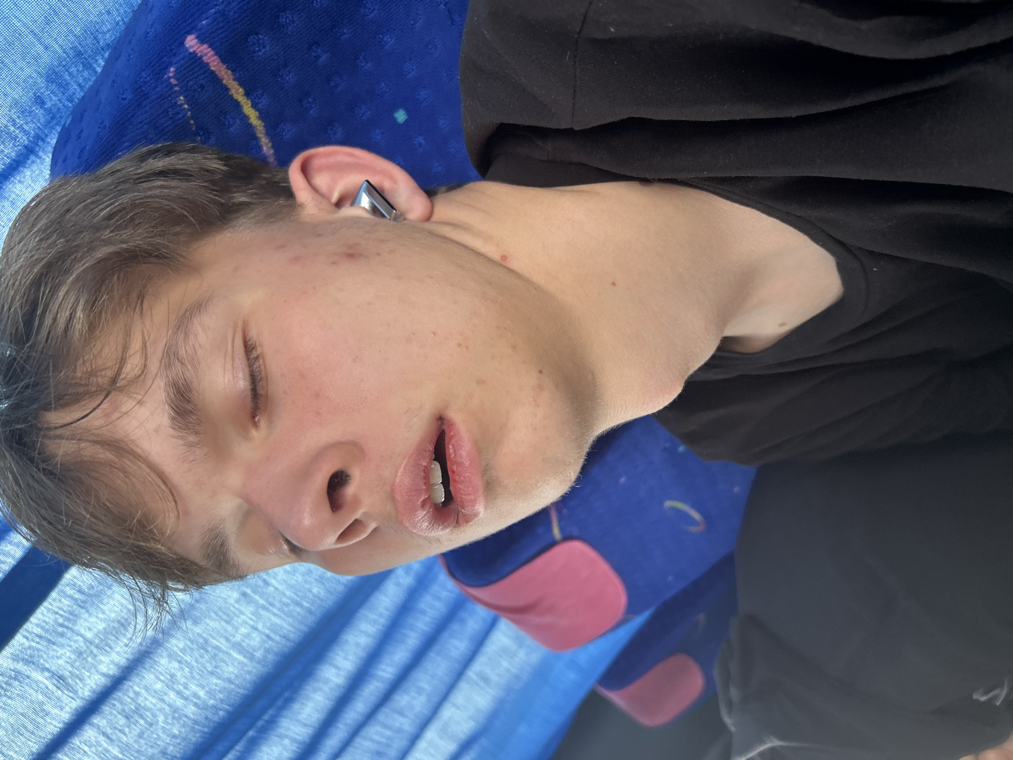 A young man is asleep on what appears to be a bus seat. He is lying on his side, with his head resting on the blue and pink patterned headrest. He has fair skin, light brown hair, and is wearing a black hoodie. His mouth is slightly open, and an earring is visible in his left ear. The location is unknown, and the city of Krushare, Bulgaria, is not evident in the image.