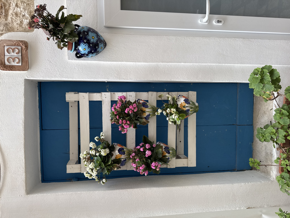 This image depicts a brightly lit building facade in Polignano a Mare, Italy. The central focus is a deep blue wooden double door, positioned within a recessed white stucco frame. Mounted centrally on the blue door is a white wooden trellis, constructed from horizontal and vertical slats. Four decorative ceramic planters, hand-painted with colorful floral motifs, are attached to this trellis. The top left planter contains white-flowering plants, the top right and middle left contain pink-flowering plants, and the bottom right contains white-flowering plants. To the right of the blue door, a white stucco wall features additional elements. A brown ceramic plaque with the raised white number "33" is affixed near the top. Below it, a dark blue, amphora-shaped ceramic wall planter adorned with light blue floral patterns is mounted, holding a reddish-brown plant. Partially visible on the far right is a vertical section of a white-framed door or window with a white handle and a visible keyhole. At ground level, below the blue door and trellis, a concrete base supports a collection of green-leafed plants, possibly geraniums, some contained within a terra cotta pot. The overall scene is characterized by whitewashed architecture contrasting with vibrant blue and floral accents. No individuals are present.