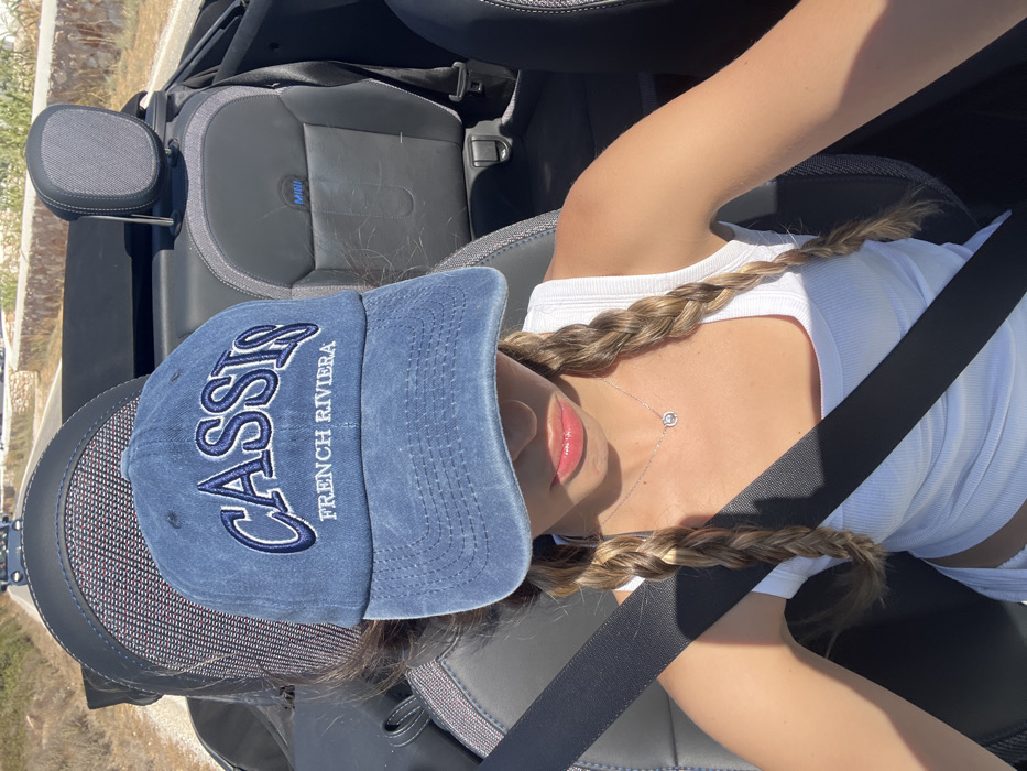 The image depicts a young individual seated in the driver's position of a convertible vehicle on a road in Dryos, Greece, under bright sunlight. The person's face is largely obscured by a faded blue baseball cap with "CASSIS" and "FRENCH RIVIERA" embroidered in white. Only their glossy lips and chin are visible. They wear a white ribbed tank top and a silver chain necklace with a small, circular pendant. Their light-colored hair is styled into two prominent braids, one on each side of the chest. A black seatbelt is securely fastened across their left shoulder and lap. The vehicle's interior features black and grey seats with textured fabric inserts; a "MINI" logo is visible on the back of the front passenger seat. The convertible roof is open. In the background, an asphalt road curves into the distance, with a dark-colored vehicle visible ahead. The environment consists of dry vegetation, low stone walls, and white, possibly stucco, buildings, consistent with Mediterranean architecture. The sky is clear and blue.