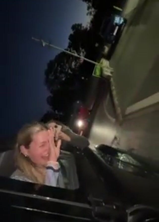 two young women in a car at night. One woman is partially out of the sunroof, looking up and laughing while covering her mouth with her hand. The other woman is inside the car, holding a phone, possibly recording. The car appears to be at a gas station or similar roadside stop, as there are signs and lights visible in the background. The scene is dimly lit, with the car's headlights illuminating the immediate surroundings.