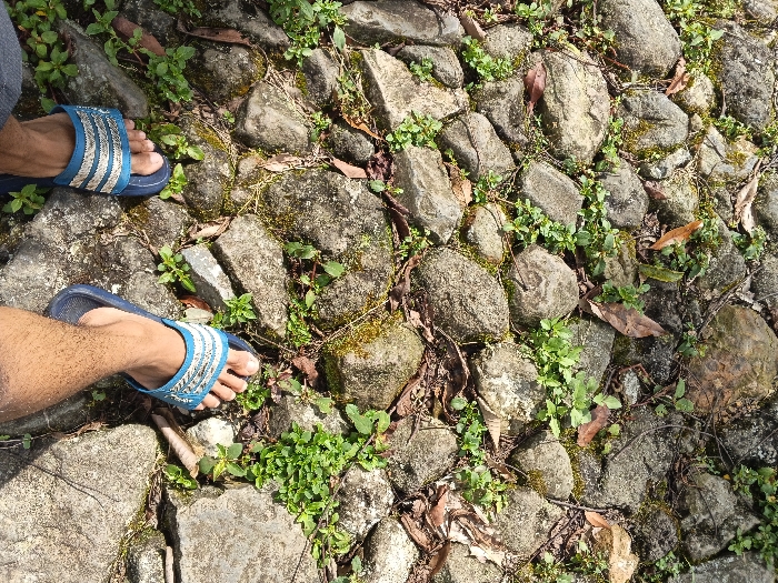 A top-down photographic view captures two human feet, clad in dark blue sandals with light blue and white striped straps, positioned on a coarse stone pathway