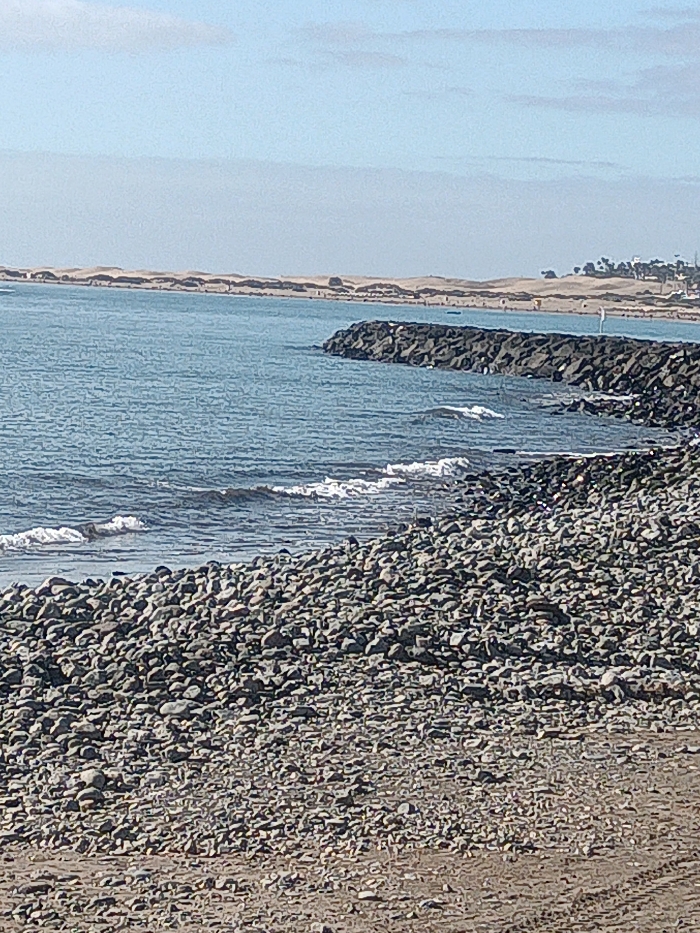 The image displays a daytime coastal landscape within San Bartolomé de Tirajana, Spain, looking across calm ocean waters towards the Maspalomas Dunes. In the immediate foreground, the ground transitions from light brown sand, exhibiting faint linear indentations, to a dense stretch of various-sized grey and brown pebbles extending to the water's edge. Gentle waves, topped with white foam, break against this pebbled shoreline. The midground consists of a blue-grey ocean, with ripples and small waves. A dark, irregular rock barrier, appearing man-made, projects into the water from the right side of the frame, creating a partial demarcation of the water. A slender white pole stands at the seaward end of this rock barrier. Across the expanse of water, the background is dominated by a long, undulating line of golden-brown sand dunes. To the far right, beyond the dunes, faint green vegetation and indistinct structures are discernible. Numerous small human figures are visible on the distant sandy beach between the rock barrier and the dunes, indicating a recreational presence. The sky above is pale blue with minimal, wispy cloud cover, under clear, ambient daylight.