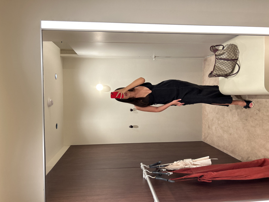 The image depicts a female subject taking a mirror selfie inside a changing room in Wichit, Thailand. The subject, with long dark hair, stands center-right, wearing a long, black, deep V-neck dress with side slits, and black slip-on shoes adorned with bows. She holds a red smartphone, obscuring her face, as she captures her reflection in a large, rectangular mirror. To the left of the subject, a metallic clothing rail protrudes from a dark brown wooden-paneled wall, holding several garments on white hangers, including a reddish-brown dress and a light-colored top. On the light beige back wall, two black wall hooks are visible, with a spherical wall sconce glowing above and between them. The light-colored ceiling features two recessed downlights and a circular smoke detector. To the right of the subject, a light-colored, vertical illuminated strip is integrated into the mirror's frame, and a light-colored partition or doorframe is visible further right. In the lower right foreground, a light-colored, curved bench or ottoman supports a beige and burgundy Gucci handbag. The floor is covered with a light-colored carpet.