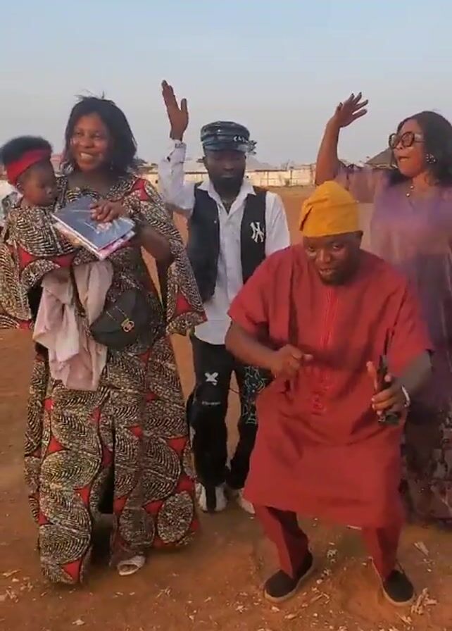 five people dancing outdoors on a reddish-brown dirt ground. A woman in a long patterned dress and headscarf carries a baby wrapped in matching fabric, and also holds a book. A man in a white shirt, black vest, and black pants dances with one arm raised. Another woman in a purple dress and glasses stands nearby with a raised arm. The man in the center wears a red tunic and pants with a yellow hat and also dances. The background includes other people walking around and some buildings in the distance under a blue sky with scattered clouds.