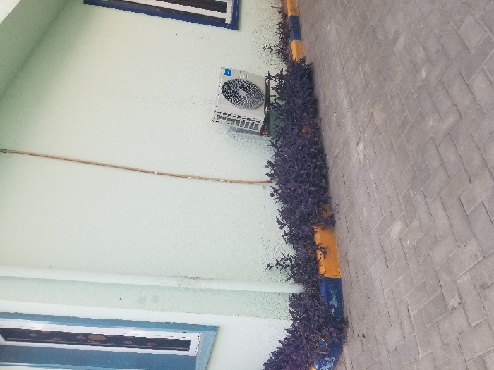 The scene depicts a light green textured building exterior in Igboefon, Nigeria. The building features a prominent corner on the left, with a window framed in blue and white trim visible on the far left and another partially visible on the far right. A light brown cable runs vertically along the wall, secured by clips. An outdoor air conditioning condenser unit, bearing the "Midea" logo, is mounted on a dark metal bracket against the wall towards the right side. Below the wall, a garden bed contains a dense growth of dark purple-leafed ground cover plants. This garden bed is bordered by a concrete curb painted in segments of blue and yellow. The foreground is paved with grey interlocking concrete pavers arranged in a herringbone pattern. No individuals, actions, or interactions are visible.