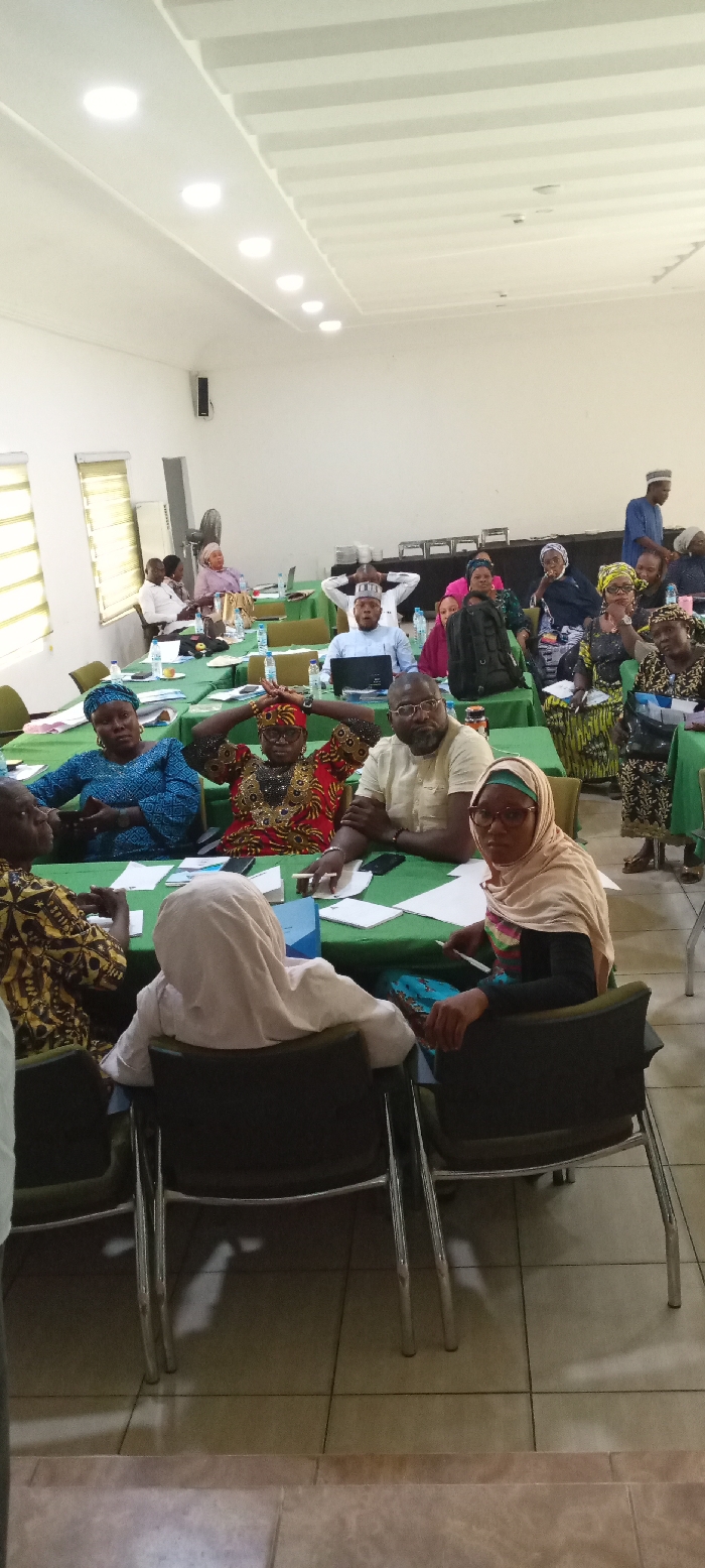 The scene depicts an indoor meeting or conference in an event room located in Yola, Nigeria
