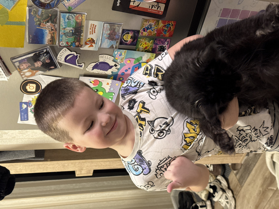 The scene is an indoor domestic setting in the city of Sirius, Russia. A young male child, approximately 4-7 years old, with short brown hair, stands centrally, slightly smiling with his head tilted down and to his right. He wears a white short-sleeved t-shirt with various cartoonish and graffiti-style graphics in black, yellow, and blue. He is holding a fluffy black cat in both arms against his torso; the cat's face is obscured, looking downwards. The child's right hand is visible near his chest, forming a thumbs-up gesture. To the right, a light-colored refrigerator door is covered with numerous magnetic souvenirs and framed photographs. Visible magnets include Russian text such as "ДРАТУТИ" and "ВАС ЖДЕТ ПРИКЛЮЧЕНИЙ," English text "HELLO" and "CEREAL," a camera icon, and various animated characters (e.g., Pikachu, Minions). Photographs depict family groups, including individuals in skeleton costumes, at a theme park, and in a snowy outdoor environment. To the left, a vertical element of light wooden furniture is visible, behind which a dark-striped wallpaper or wall paneling can be seen. The floor is a light wood or laminate, and several pairs of shoes, predominantly white and grey athletic footwear, are scattered on the floor in the lower-left quadrant. The area is illuminated by internal lighting.