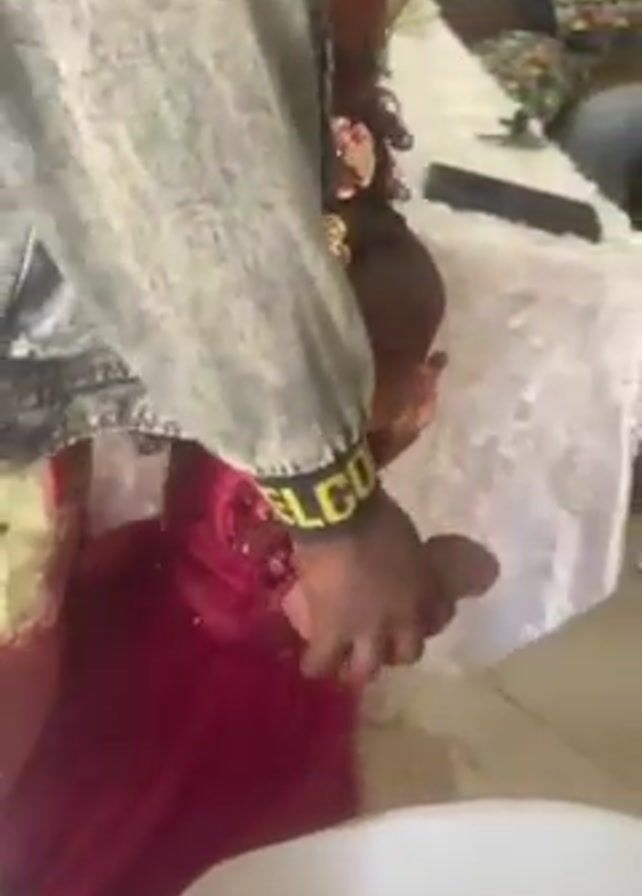 A young Black child wearing a dark red dress and floral hair decorations is standing and appears to be held or guided by an adult. The adult, wearing a gray jacket with "VOLCOM" lettering on the sleeve, has their hands near the child's waist. The scene takes place indoors, with furniture and other individuals partially visible in the background. The floor appears to be tiled. The lighting is general and somewhat dim.