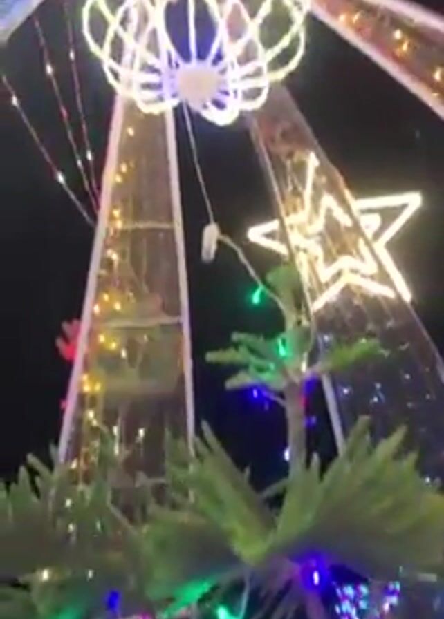 nighttime scene of Christmas decorations. There are two tall, pyramid-shaped structures adorned with string lights. A large, illuminated star sits atop one structure. The decorations also include a real Christmas tree with colorful lights. The background is dark, suggesting a night setting.