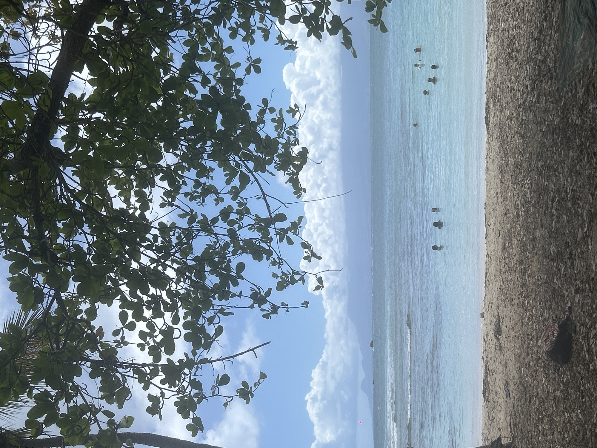 The image depicts a beach scene in Le Gosier, France, observed from beneath the canopy of a large tree. The foreground consists of dark brown sand and small debris, possibly dried leaves or seaweed. A dark bag or object with a striped fabric item on top is visible on the sand near the lower center. The midground features the calm, light blue ocean. Approximately seven to nine individuals are visible in the water, partially submerged, indicating swimming or wading activities. Gentle waves break closer to the shore. In the distant water, several small rock formations or islands are present. Two small, faint pink markers or buoys are discernible on the left side of the water. The background reveals a clear blue sky interspersed with large, white cumulus clouds. A hazy, distant landmass, likely a mountain range, is visible on the horizon. Overhanging the upper portion of the frame are dark green leaves and branches from a tree, likely tropical foliage such as sea grape, with a segment of a palm tree trunk visible on the far left.