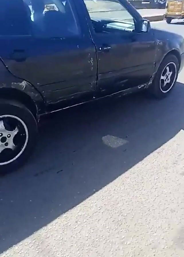 A black station wagon with a worn exterior and custom rims is parked on an asphalt street. The car has noticeable damage along its lower panels and wheel wells. The street is in a sunny environment, casting a long shadow from the vehicle. In the background, blurred images of other vehicles, including a yellow motorized tricycle, and pedestrians are visible, suggesting an urban or suburban setting. The camera angle is low, focusing on the car’s side profile and wheels.