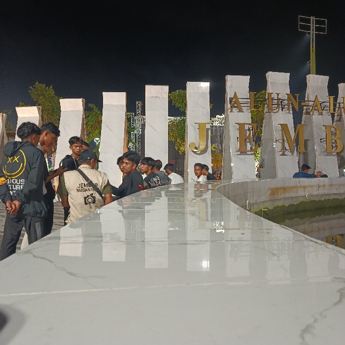 The image depicts a nighttime scene at Alun-Alun Jember, Jember, Indonesia