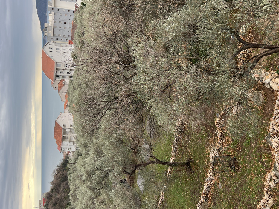 The image depicts an elevated view of Rafailovići, Montenegro, on an overcast day. In the foreground and midground, a terraced olive grove dominates the landscape, featuring numerous olive trees with silvery-green foliage, interspersed with a few deciduous trees exhibiting bare branches. The ground is covered in green grass with scattered fallen leaves, and low, winding dry-stone walls define the terraces. A black metal structure, possibly a fire pit or grate, is visible in one of the grassy sections. In the background, multiple buildings rise on the hillside, situated between the grove and the sea. These include white-facaded structures with distinct red-tiled roofs, some featuring balconies. To the right, taller, grey multi-story apartment buildings are visible. Beyond the urban development, the calm Adriatic Sea extends to the horizon, reflecting a lighter patch of sky. A distant landmass is faintly discernible on the far right horizon above the water. The sky is largely cloudy with varying shades of grey, with a lighter, yellowish-grey band visible near the sea horizon. No individuals or active subjects are present in the scene.