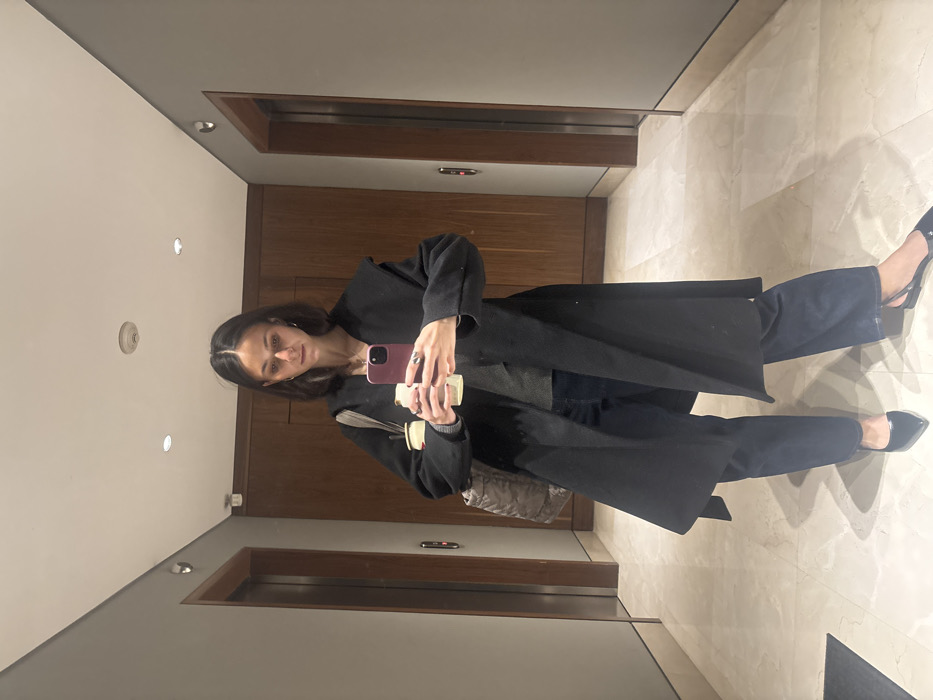 A female individual stands centrally in a well-lit, modern indoor hallway, holding a smartphone in her right hand as if capturing a reflection. She wears a long, open black overcoat, a dark grey sweater, and dark blue trousers. Her footwear consists of black pointed-toe flats. Her left hand holds a light-colored cylindrical object, possibly a beverage container, and a light-colored, quilted shoulder bag hangs from her left shoulder. The hallway features a polished, light-colored marble or stone floor, light grey walls, and a white ceiling with recessed lighting and a smoke detector. Two elevator doors with metallic panels and dark wood frames are visible on the left and right, with a large, dark wood door positioned in the background. The specific location within Mexico City, Mexico, cannot be determined from the visual evidence in the image.