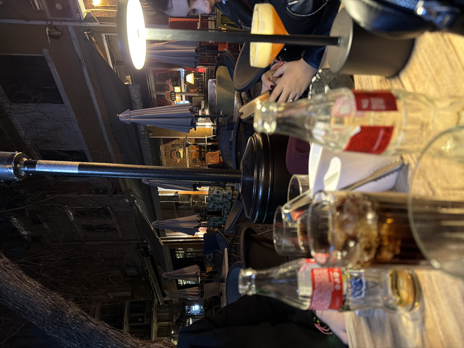 The image captures an outdoor cafe scene at night in Plovdiv, Bulgaria. The background distinctly shows "CENTRAL PERK" signage, characteristic of a "Friends"-themed cafe, alongside "BREW HOUSE" signage, situating the location within a commercial street or pedestrian area of the city. In the immediate foreground, a wooden table displays two empty glass Coca-Cola bottles, a glass tumbler filled with a dark carbonated beverage and ice, and a white container holding utensils, including metal tongs. A black cylindrical table lamp with an illuminated top is positioned on the table to the right. A person with dark hair, wearing a dark jacket, is partially visible on the right side of the table, engrossed in a smartphone held with both hands. Their right hand displays a ring. Adjacent to this individual is an orange cocktail served in a stemmed glass. Another person's arm, adorned with a colorful bracelet, is partially visible on the left side of the table. A prominent black outdoor patio heater stands in the mid-ground. The background features several more outdoor cafe tables and chairs, covered by numerous folded grey patio umbrellas. Building facades are visible behind the cafe establishments, with warm light emanating from their interiors. Bare tree branches are discernible on the left, suggesting a seasonal context. The scene is illuminated by various artificial light sources, including the table lamp, interior cafe lights, and street lighting. No direct interaction between the two partially visible individuals is depicted.