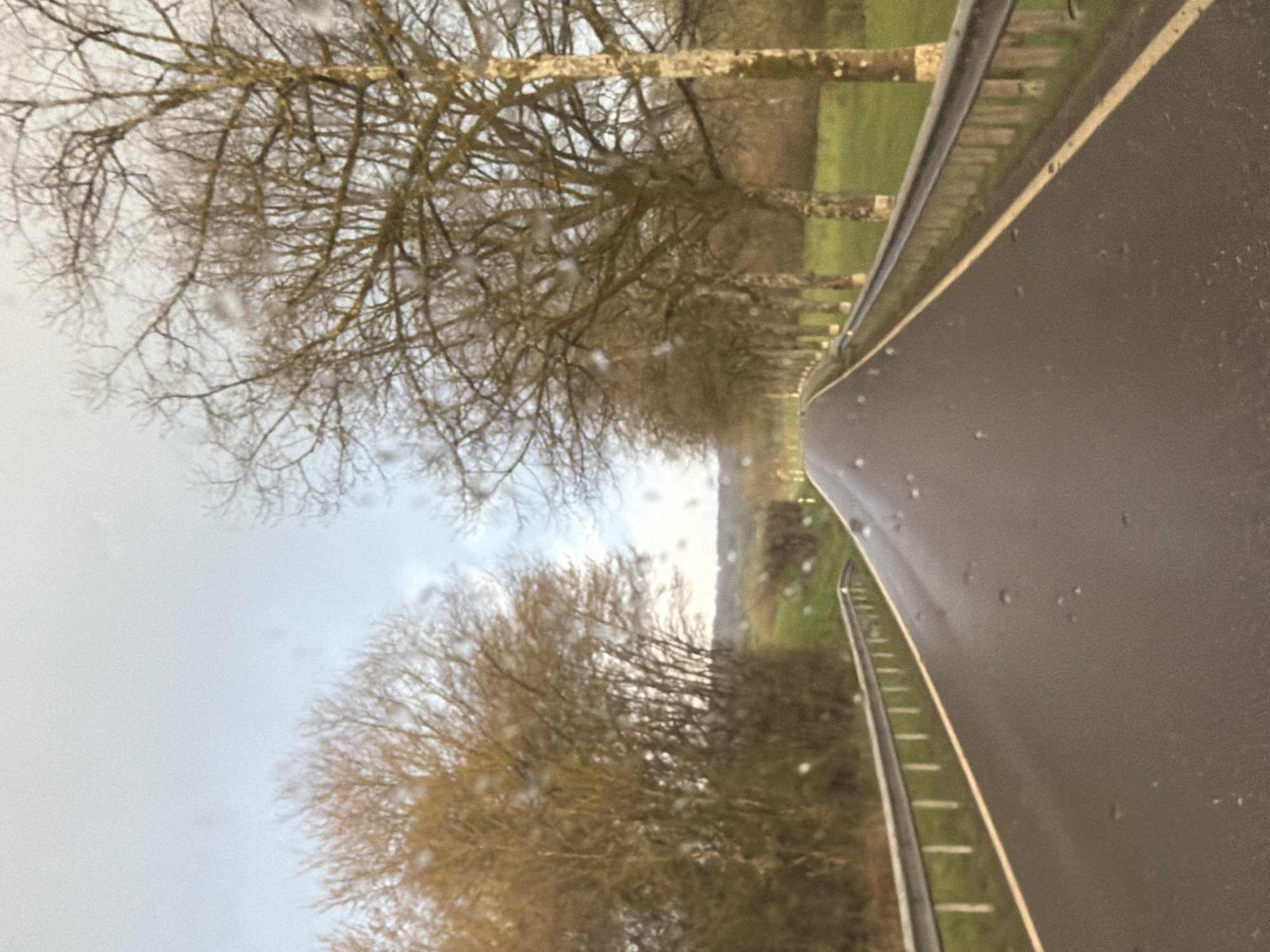 A ground-level perspective shot from inside a vehicle traversing a wet road in Junglinster, Luxembourg. The overcast sky is visible through the car's rain-spotted windshield. A row of leafless trees lines the left side of the road. A metal guardrail runs along the right side of the road. The road surface is dark and wet.
