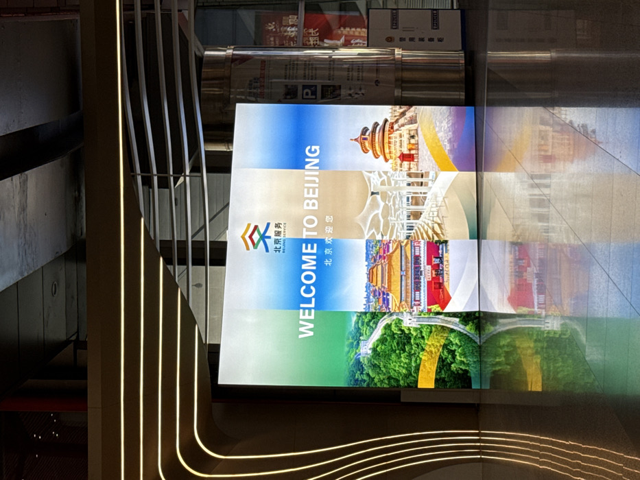 The image depicts a brightly illuminated, large-format digital display or poster board positioned within a modern, indoor public space. This location is identified as likely being Beijing Capital International Airport, specifically in Shunyi District, China, based on the signage and architectural style. The central subject is the display, which prominently features the English text "WELCOME TO BEIJING" in white capital letters. Above this, a colorful logo for "北京服务" (Beijing Service) is visible, and below it, the Chinese characters "北京欢迎您" (Beijing Welcomes You) are present. The display's background is divided into four vertical panels, each showcasing a distinct iconic image of Beijing: from left to right, a winding section of the Great Wall through lush green hills, a traditional red-walled palace building with a golden roof (resembling the Forbidden City), a modern white architectural structure with a patterned canopy, and the Temple of Heaven's Hall of Prayer for Good Harvests. The floor in the foreground is composed of reflective, polished tiles that mirror the colors and images of the display. To the left, a dark, curved architectural feature incorporates multiple horizontal and vertical lines of bright, warm-toned strip lighting. The ceiling appears dark and features exposed structural elements. To the right of the display, a reflective, cylindrical metallic column is partially visible, behind which additional vertical signs with Chinese text and a "P" symbol can be discerned. No individuals are present in the scene, and no specific actions or interactions are occurring. The environment suggests a clean, well-lit, and contemporary public area, such as an airport terminal.