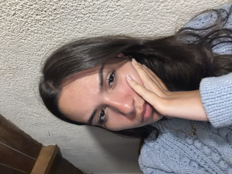 A young woman with long, dark brown hair is looking at the camera. She rests her face on her right hand. She wears a light blue cable knit sweater. Her skin has a light, somewhat ruddy complexion. The background is a textured white wall at the top and a wooden structure at the lower left. The image is slightly rotated to the left.