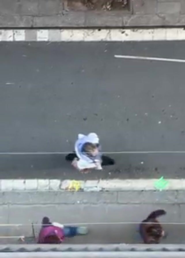 The video is a top-down view of a street with two people walking on the sidewalk, a tree, and some trash on the ground. The street appears to be deserted, with no cars visible. The person nearest the camera is wearing a pink or purple sweater, the other is wearing a white shirt. The trash appears to be discarded plastic wrappers or bags. The video is shot from an elevated position, likely a building overlooking the street.