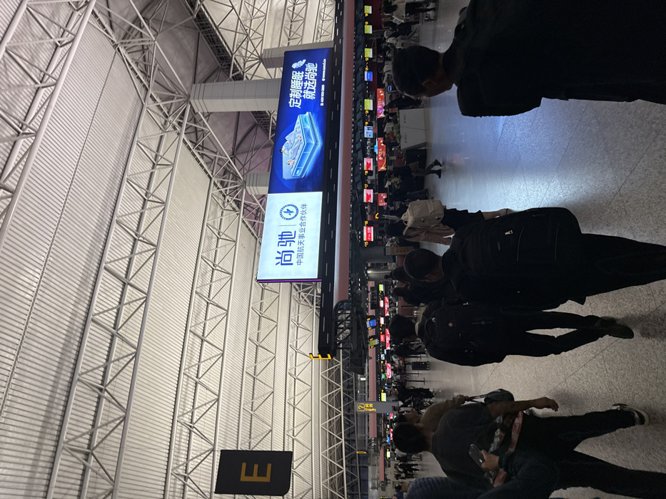 The image depicts a bustling concourse within Guangzhou Baiyun International Airport (CAN), Guangzhou City, China. A high, arched ceiling features ribbed metallic panels supported by an extensive network of exposed grey structural trusses. On the left, a black square sign with a white capital "E" hangs from the ceiling. Dominating the mid-ground are two large, illuminated digital billboards positioned above a row of check-in counters. The left billboard displays "尚驰" (Shangchi) in white against a blue background, along with the text "中国航天事业合作伙伴" (China Aerospace Partner). The adjacent right billboard shows a graphic of a mattress with stylized figures and the Chinese phrase "定制睡眠 就选尚驰" (Customized sleep, choose Shangchi). Below these, multiple check-in counters are visible, each with individual red-hued digital displays indicating counter status. The floor is a light, polished surface. Numerous individuals are present, predominantly walking away from the camera in the foreground and towards the check-in counters in the mid-ground and background. Many individuals are carrying dark backpacks. One person on the far left holds a smartphone. In the distance, other travelers are observed, some with rolling luggage. A yellow square sign featuring a question mark and an arrow is visible in the middle left. The scene is brightly lit, reflecting an active, indoor transportation hub.