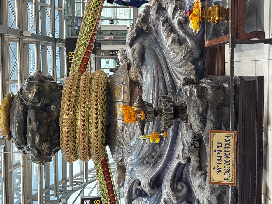 The image displays a large, ornate sculpture depicting the Samudra manthan, or Churning of the Ocean of Milk, situated within an airport terminal in Nong Prue Subdistrict, Thailand