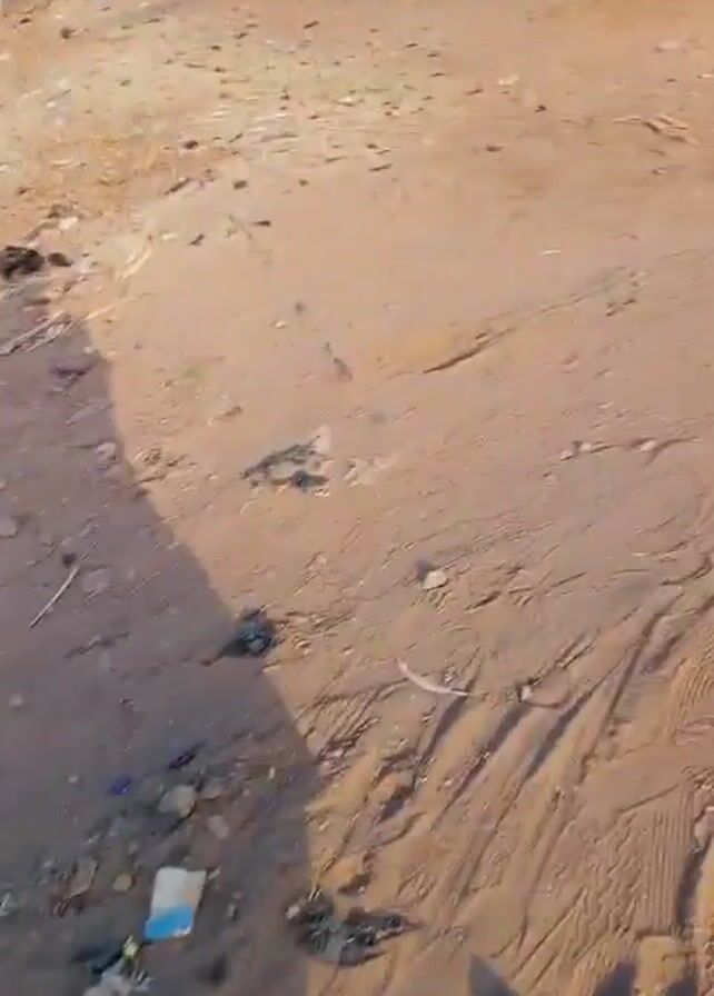 dirt road in what appears to be a rural or impoverished area. The road is uneven and littered with debris. In the background, there are small buildings, some of which look like shops or stalls. There are also some trees and palm trees visible. The video is shaky and appears to be taken while walking. The lighting suggests it's daytime. There is a shadow of the videographer visible in the frame.