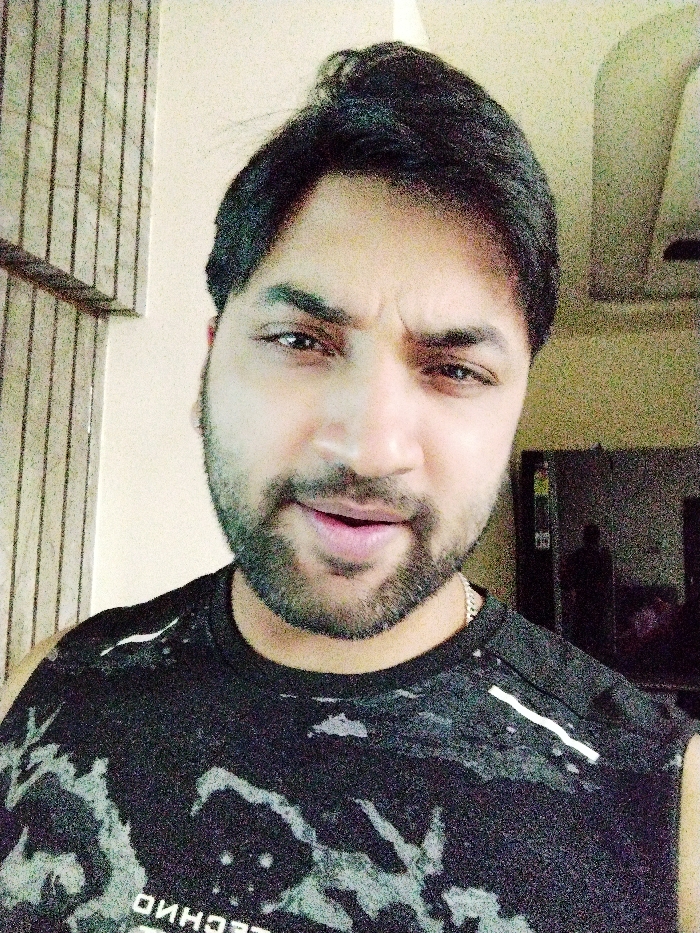 A man with dark hair, a beard, and a slight furrow in his brow looks directly at the camera. He is wearing a black sleeveless shirt with a white splatter pattern and a reflective stripe on the shoulder. The background consists of a wall with vertical lines and a partially visible doorway with someone silhouetted inside. A light fixture is also visible in the upper right corner. The overall lighting is somewhat grainy.