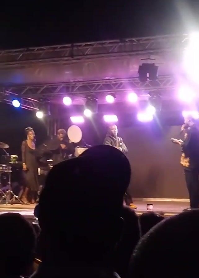 live performance on a stage, likely at a music festival or concert. The stage is lit with bright white and purple lights, highlighting a band of performers. The band includes a woman in a black dress, a drummer, and several other musicians. At one point, a man in a jacket crosses the stage to talk with another man in a black suit. The camera's point of view is from the audience, and the silhouettes of many heads are visible in the foreground.
