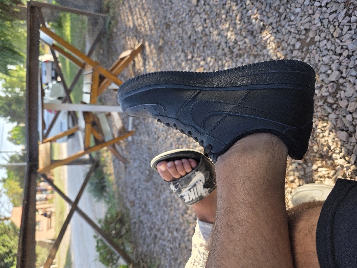 A black Nike Air Force 1 shoe is balanced on an unshaven leg
