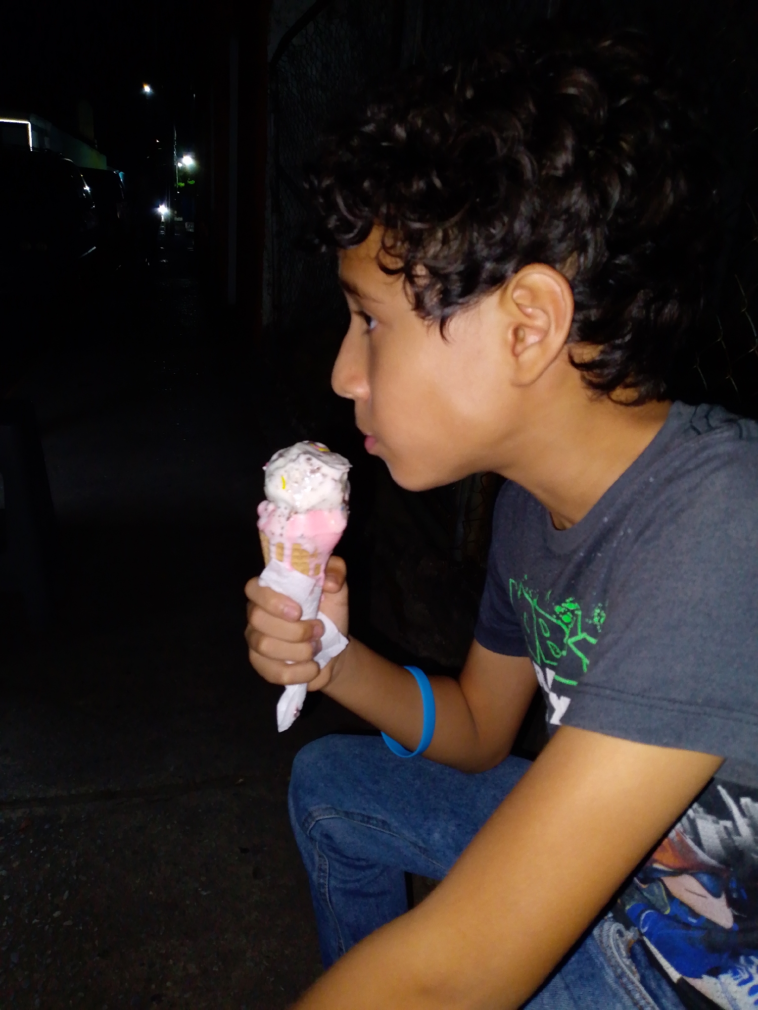 - "A young person with curly dark hair and brown skin is holding an ice cream cone outdoors at night" by FM-1fjaU2, licensed under CC BY 4.0