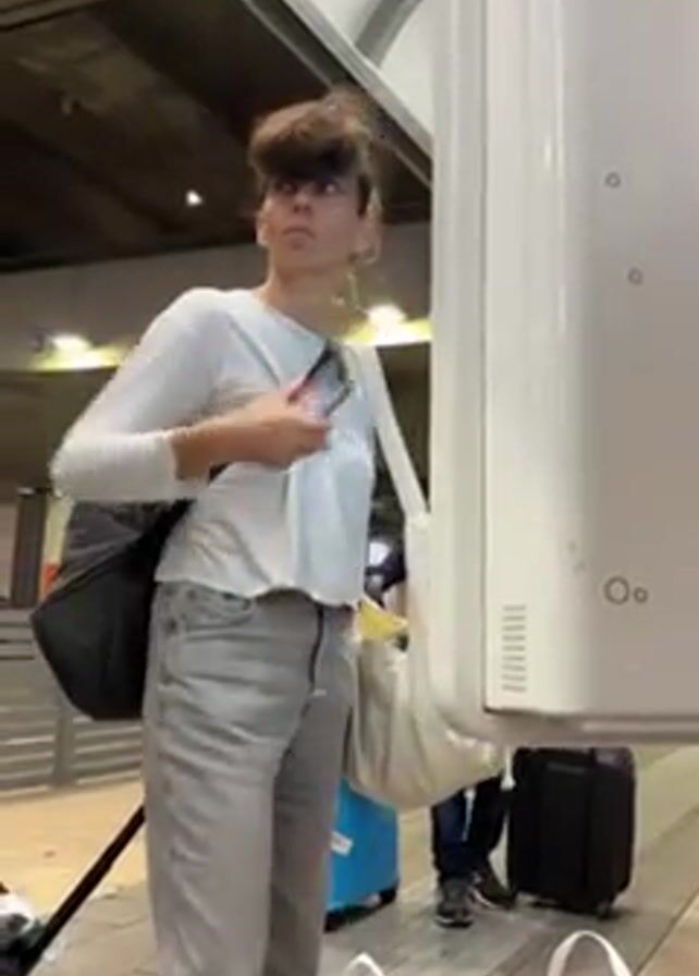 A woman with curly hair and bangs smiles and laughs at something behind the camera. She is standing at a train station in front of a train car. She is wearing a white long-sleeved shirt, light gray jeans, and has a black bag slung over one shoulder and a larger off-white bag on the other. She is holding her phone in her left hand. There are other people and luggage behind her.