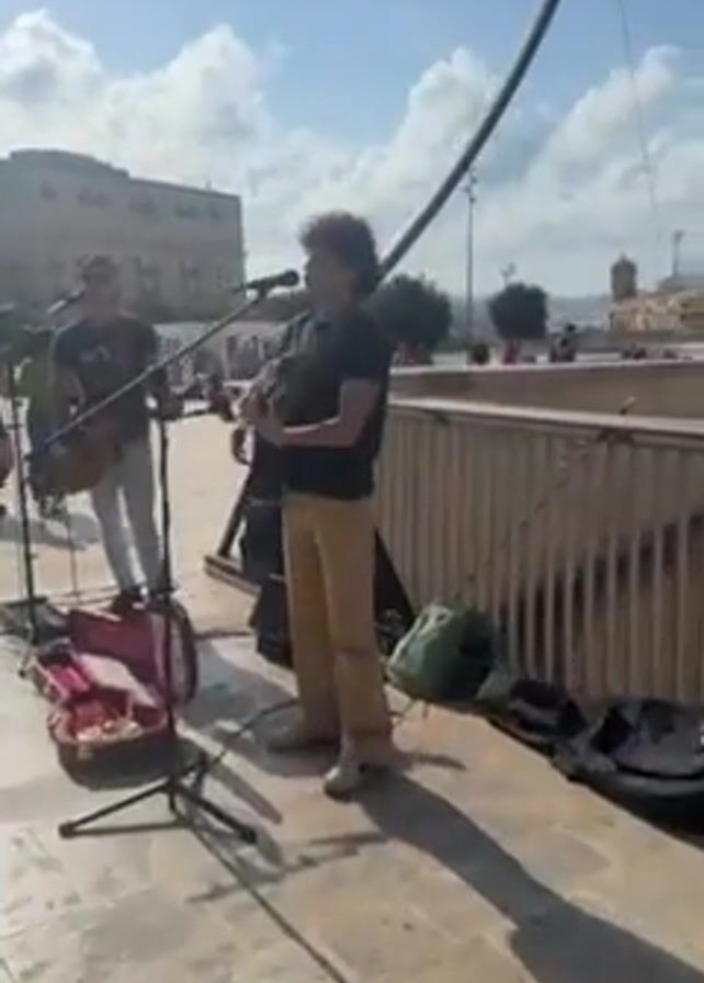 Two men are playing acoustic guitars and singing in front of microphones. They are performing outdoors on a sunny day, with a light blue sky and some clouds. Behind them is a stone wall and a view of buildings. The man on the right is wearing a black shirt and beige pants. The man on the left is wearing a black shirt and light-wash jeans. There is a guitar case open on the ground. The case has a sign inside. There are some bags on the ground near the musicians, and a tall metal structure behind them.