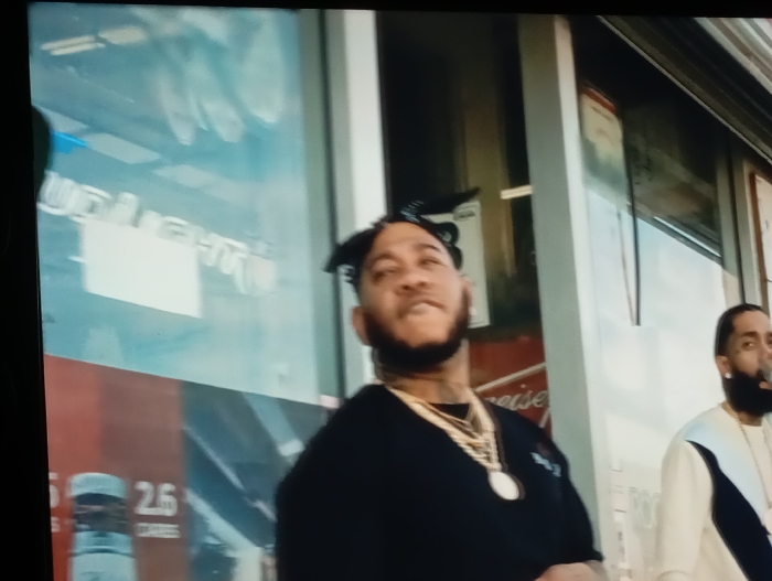 Two men stand outside a building with windows and vertical white columns. The man in the foreground wears a black t-shirt, multiple gold necklaces, a bandana, and has tattoos on his neck. Behind him, a second man wears a white and blue garment with a gold chain, beard, and has a cigarette in his mouth. Reflected in the window are various signs.