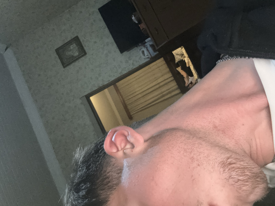 The image presents a close-up, upward-angled view of the right side of an individual's head, neck, and upper shoulder, situated within an indoor residential environment