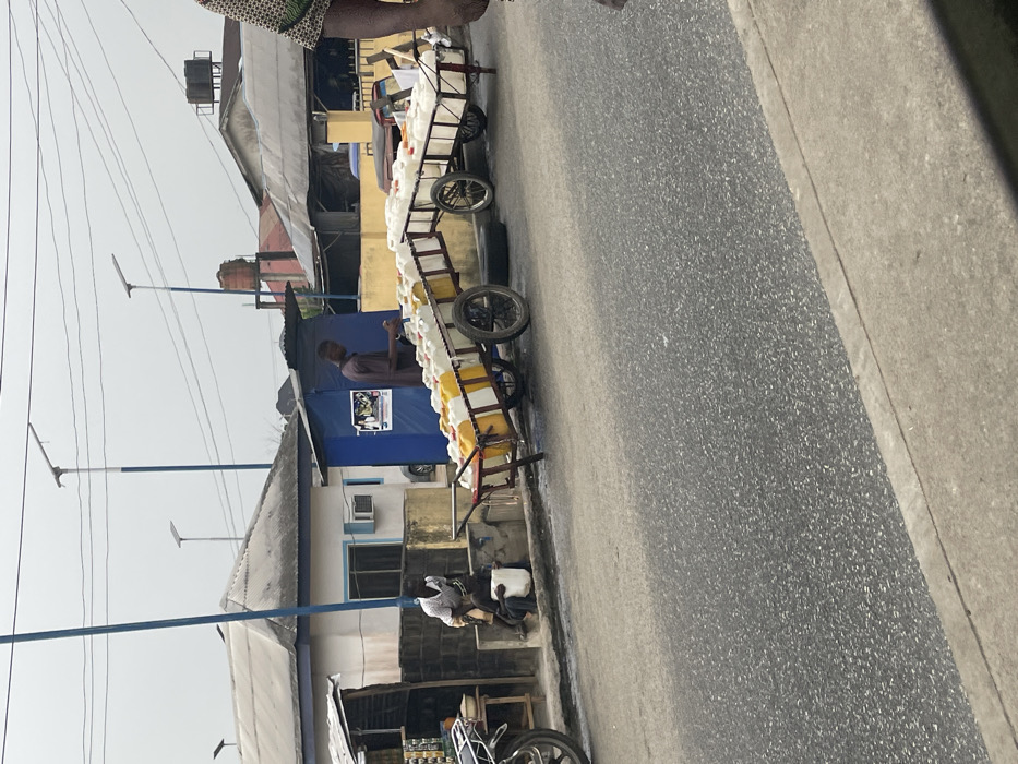 The image captures a street scene in Yenegoa, Nigeria, under an overcast sky