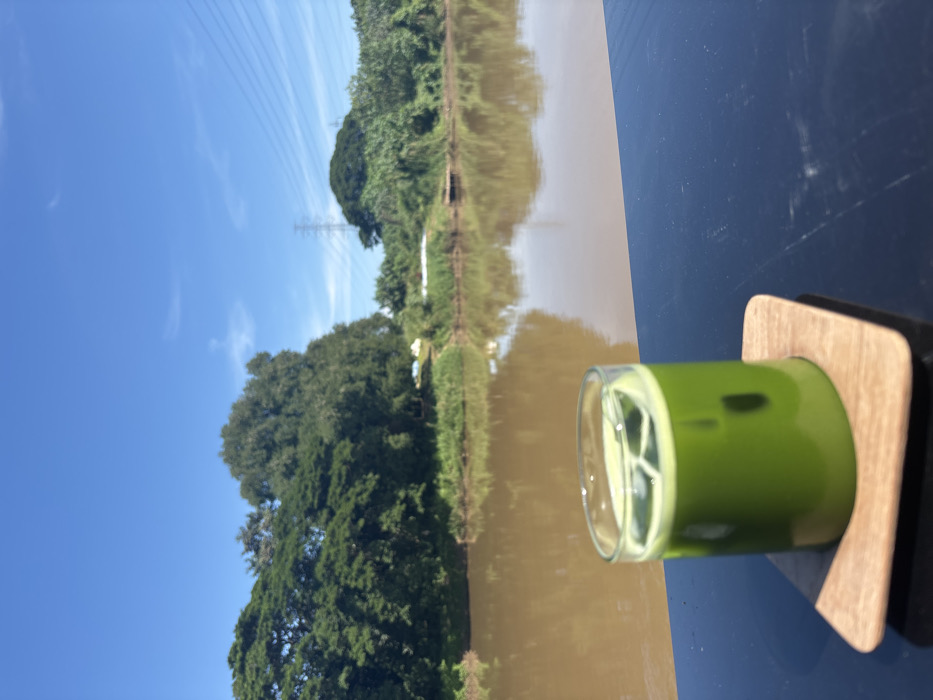 A glass of green drink sits on a wooden coaster against a blurred landscape. The scene includes a body of water reflecting trees and a blue sky with visible power lines. The background features lush green vegetation. The overall composition suggests a calm and natural setting.