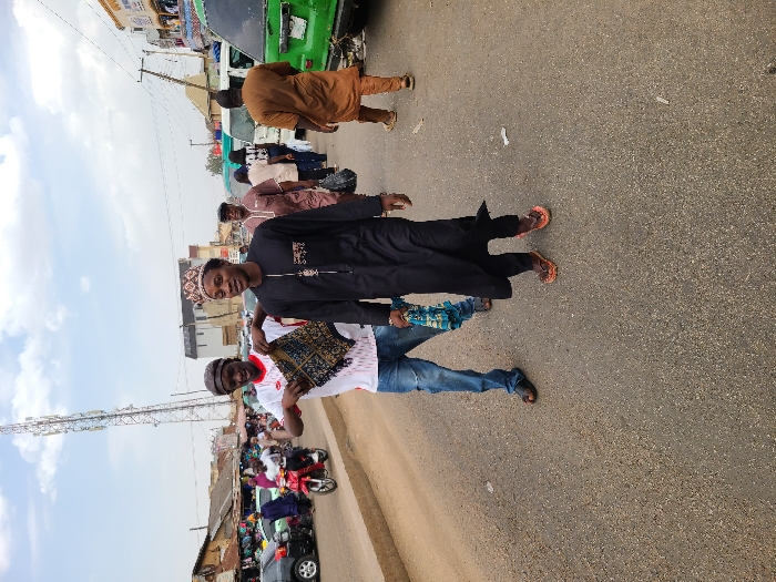 The image captures an outdoor street scene in Unknown, Unknown, under a partly cloudy sky. Two young adult males are prominent in the foreground. The male on the left wears a white t-shirt with red accents, ripped blue jeans, dark sandals, and a dark cap; he is holding up a small, dark textile object with intricate gold geometric patterns. The male on the right wears a black long-sleeved tunic with white and gold embroidery, orange flip-flops, and a patterned cap; he carries a folded blue and white patterned cloth and is looking towards the camera with a slight smile. Both individuals are walking on a grey asphalt road. In the background, a busy urban environment unfolds. To the left, a tall cellular telecommunications tower stands against the sky, above market stalls featuring corrugated metal roofs, parked vehicles (including a black car and a red motor scooter with a rider), and numerous pedestrians. To the right, parked and moving vehicles, including white minivans and a partially visible bright green van, line the street. More pedestrians, including a man in a brown traditional garment, are visible walking. Utility poles and overhead wires traverse the upper frame, connecting to buildings that line the street in the distance.