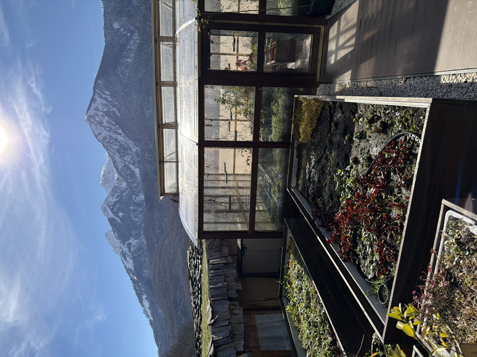 A sideways view reveals a greenhouse beside raised garden beds with various plants. A grand mountain range looms in the background under a blue sky with a bright sun. The greenhouse structure is wooden with a transparent roof. The garden beds hold a mix of greenery and red-leaved plants. There is a stone building in the background.
