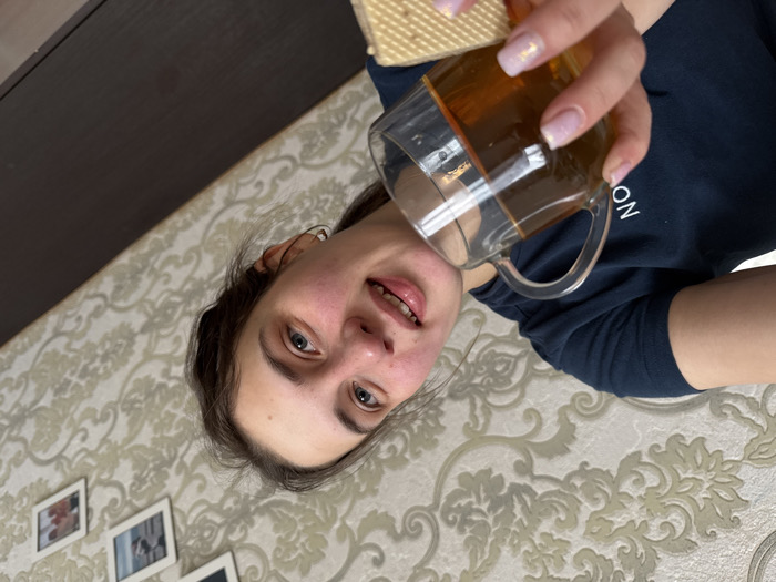 The image depicts a young adult female positioned centrally, looking upwards towards the camera with a slight smile. The specific location within Chaikovsky, Russia, cannot be determined from visual evidence within the image. She has fair skin, blue eyes, and dark hair. She is wearing a dark blue long-sleeved top, with partial white lettering visible on her right shoulder area. Her right hand holds a clear glass mug containing a dark amber liquid, positioned above her head. Her fingernails are manicured with a light, iridescent polish, and a small golden decal is present on her right ring finger. Her left hand is partially visible, holding a light-colored, rectangular wafer cookie directly above the mug. The background consists of a wall covered in light-toned wallpaper featuring a repeating ornate pattern. A dark brown piece of furniture is visible in the upper left quadrant of the frame, and several white-framed pictures are affixed to the wall in the lower left quadrant, below the subject's head.