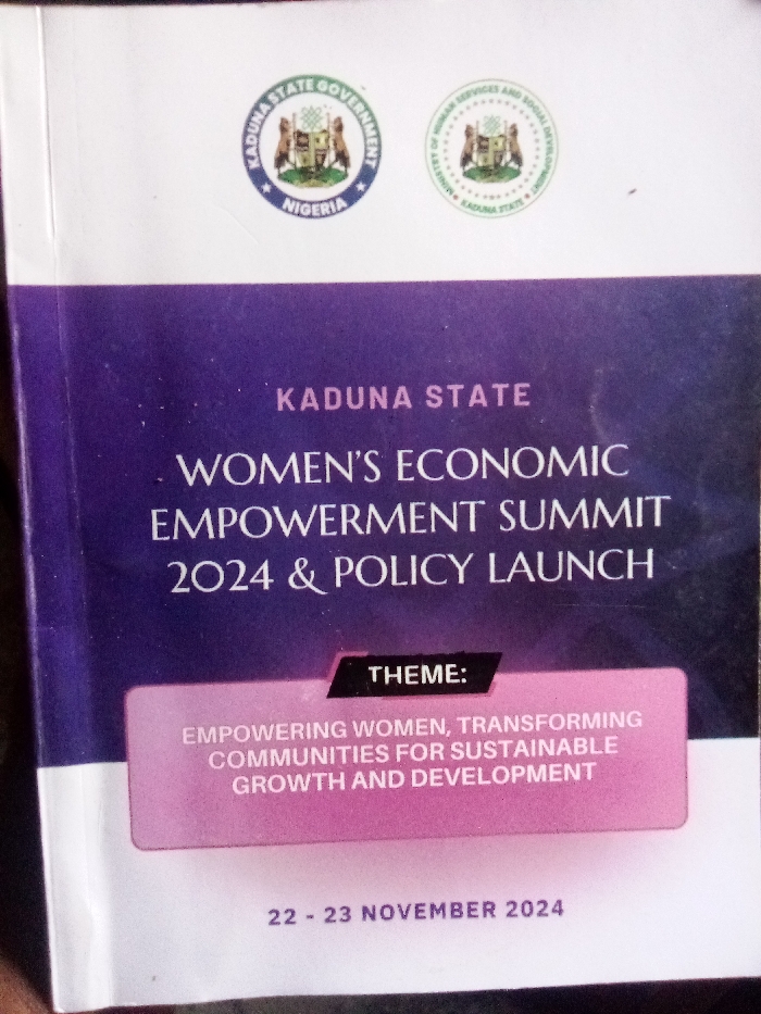 A close-up photograph displays the front cover of a program or flyer for an event. The document features a white top section, a dominant purple central section, and a white bottom section. At the top, on the white background, two circular emblems are present. The left emblem, larger and more distinct, identifies "KADUNA STATE GOVERNMENT" at its top and "NIGERIA" at its bottom, encircling a coat of arms depicting two bears supporting a shield. To its right, a smaller, less distinct circular emblem reads "MINISTRY OF HUMAN SERVICES AND SOCIAL DEVELOPMENT KADUNA STATE," also containing a coat of arms. The central purple section prominently displays white, capitalized text: "KADUNA STATE WOMEN'S ECONOMIC EMPOWERMENT SUMMIT 2024 & POLICY LAUNCH." Embedded within this purple area, slightly below the main title, is a pink rectangular box. A small black banner overlaps the top left of this pink box, containing the white text "THEME:". Below this, within the pink box, the theme is written in white, capitalized text: "EMPOWERING WOMEN, TRANSFORMING COMMUNITIES FOR SUSTAINABLE GROWTH AND DEVELOPMENT." At the bottom of the document, on the white strip, the event dates are printed in dark text: "22 - 23 NOVEMBER 2024". The document appears to be printed on glossy paper, with a slight crease visible along the left vertical edge. No people are visible; the image focuses solely on the document itself, which is presented against an indistinct, dark background. The event, as indicated by the document, pertains to Kaduna State, Nigeria. The specific location within the city of Unknown, Unknown (implied to be in Kaduna State) is not depicted in the image.
